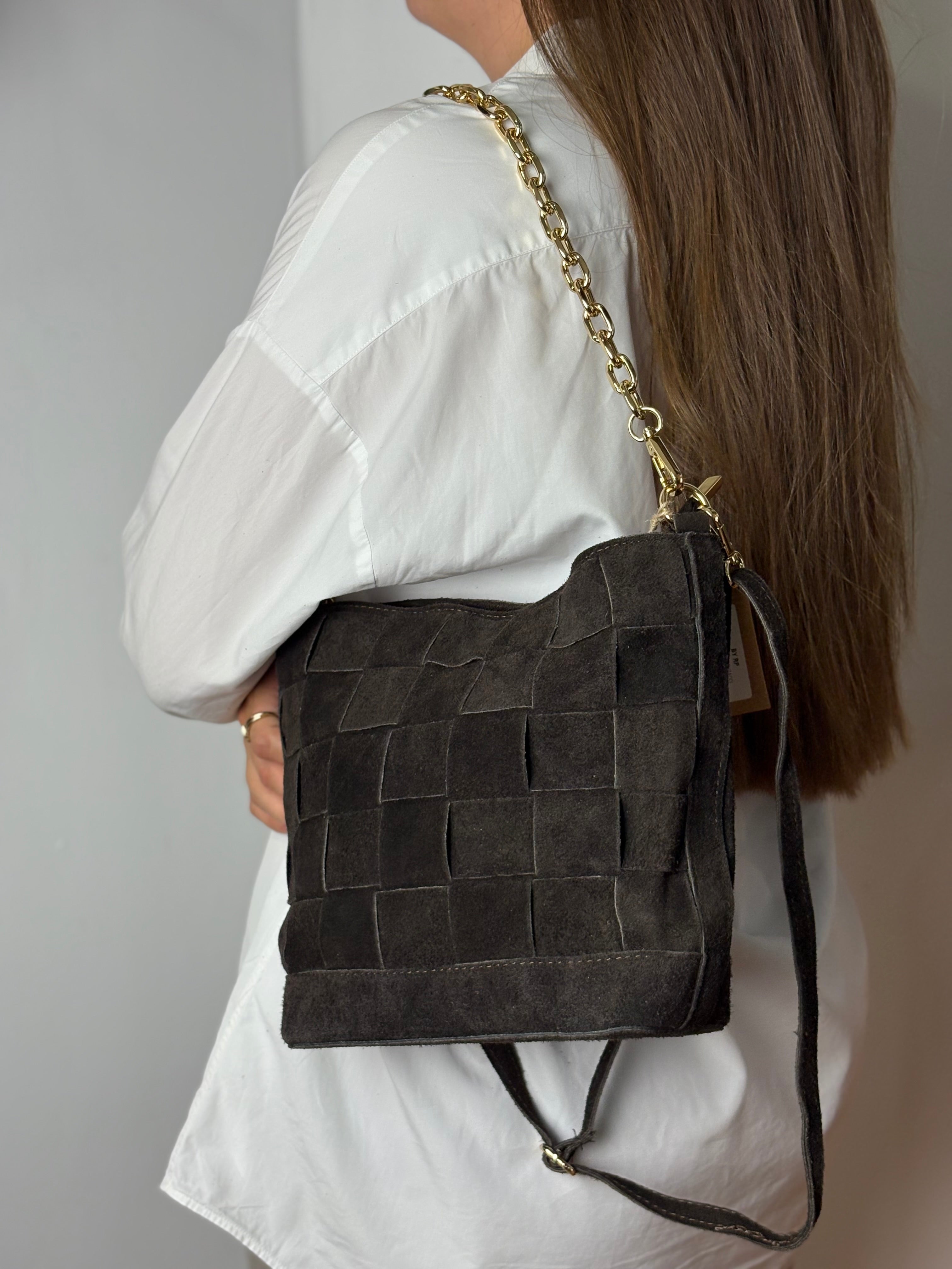 Bolso tipo cubo. Multiposicion. Bandolera de cadena y bandolera ajustable.