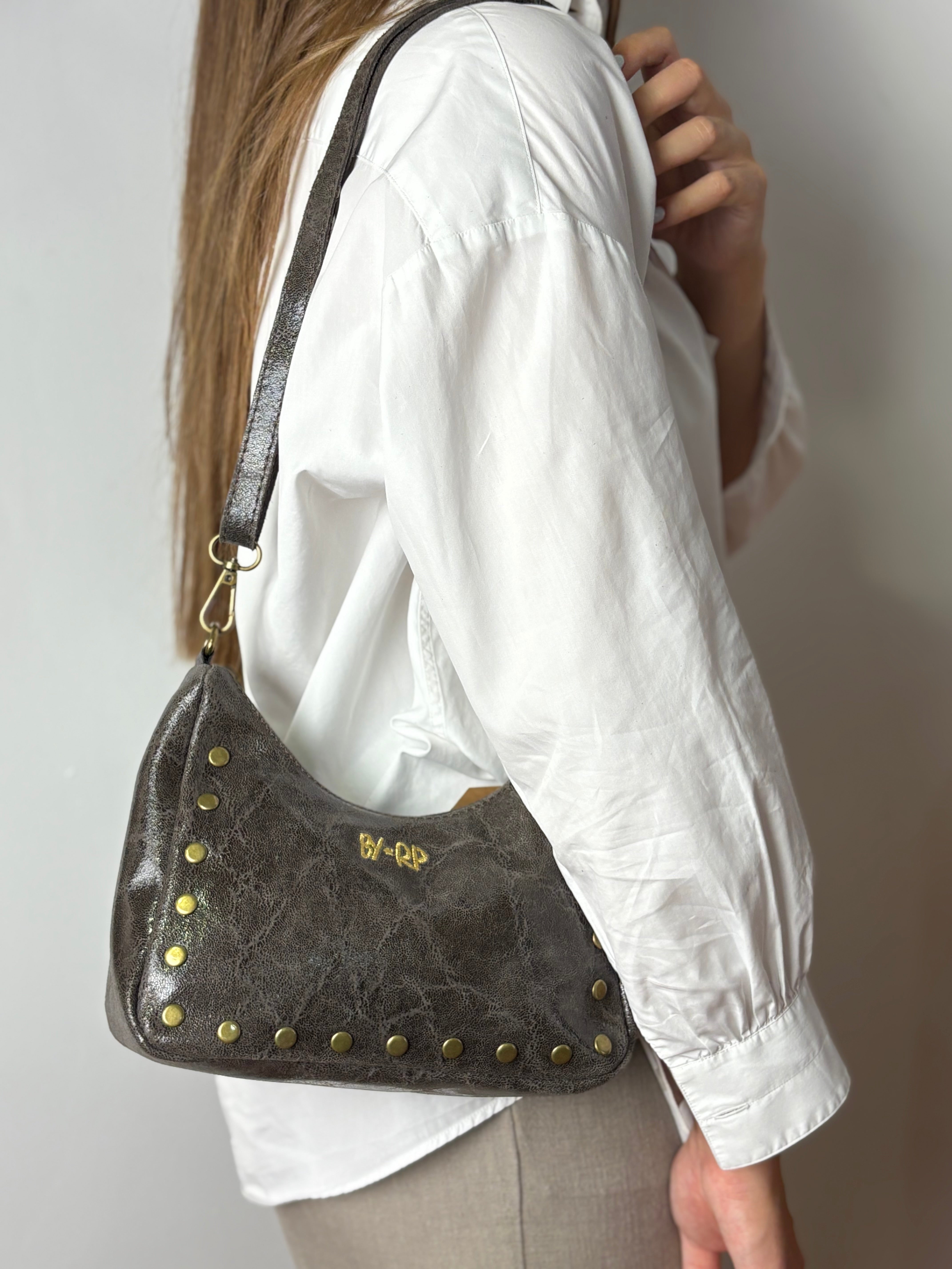 Bolsito media luna con tachuelas. Bandolera regulable.